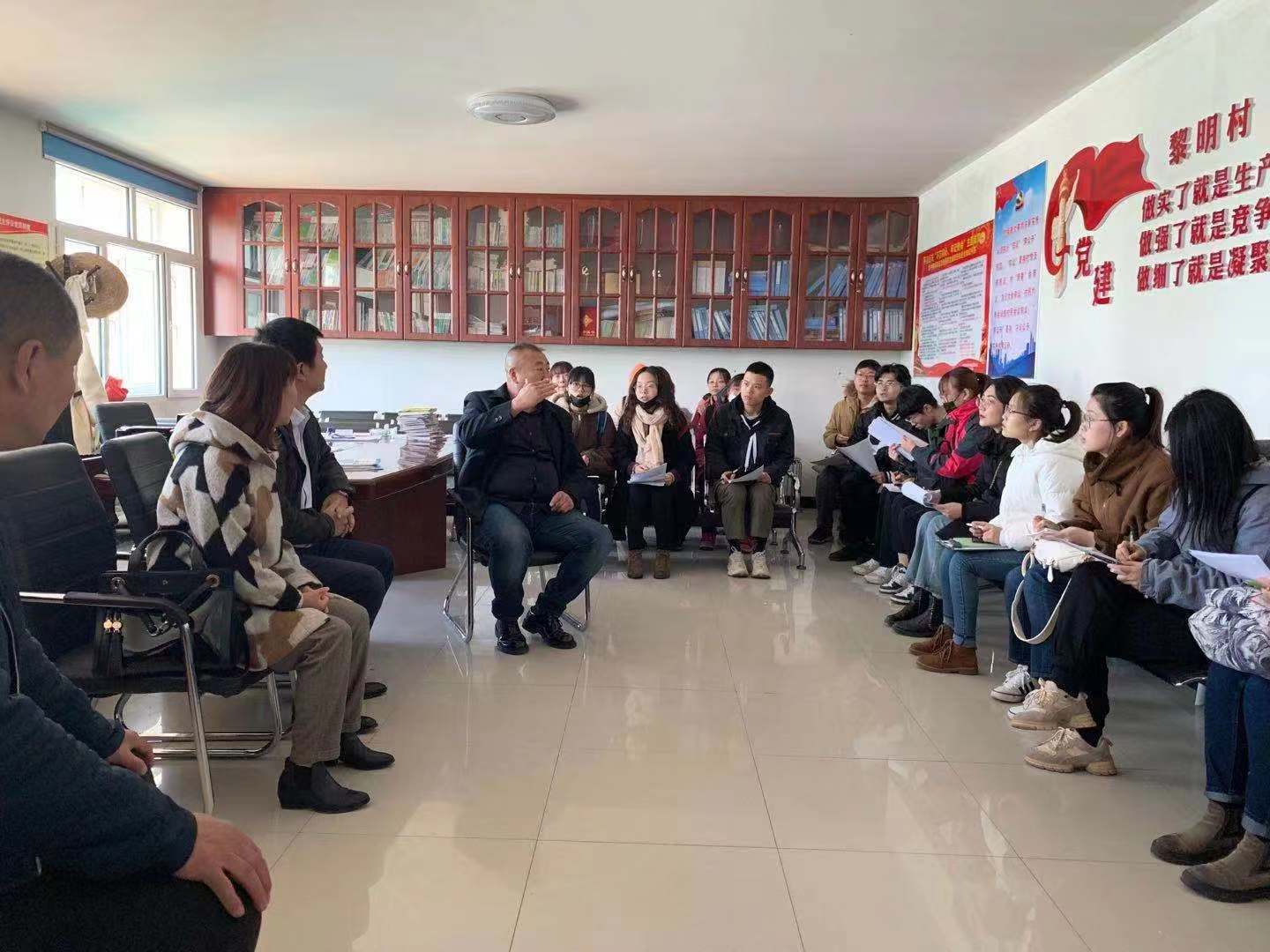 在黎明村党支部会议室聆听村支书贾书记介绍情况
