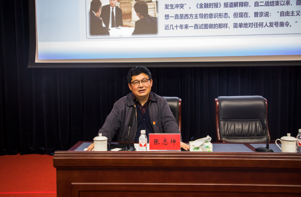 为模范践行习近平总书记在全国学校思想政治理论课教师座谈会讲话中提出的领导干部带头讲思想政治理论课的要求,进一步深入一线与学生面对面开展大学生思想政治教育,推动学校“不忘初心、牢记使命”主题教育不断深入。10月28日下午,学校党委书记张志坤以《“‘百年未有之大变局’都有哪些‘变’”——关于“百年未有之大变局”战略命题的一点解读》为题,在成栋楼四楼会议室为学生和全体学生思政工作干部上了一堂内涵丰富、别开生面的思想政治理论课。副校长雒文虎主持本次授课。